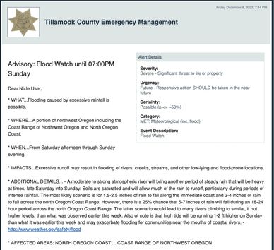 Nestucca Schools: Will be in session as normal on Thursday 12/7/2023. Buses will be operating on alternative routes due to flooding